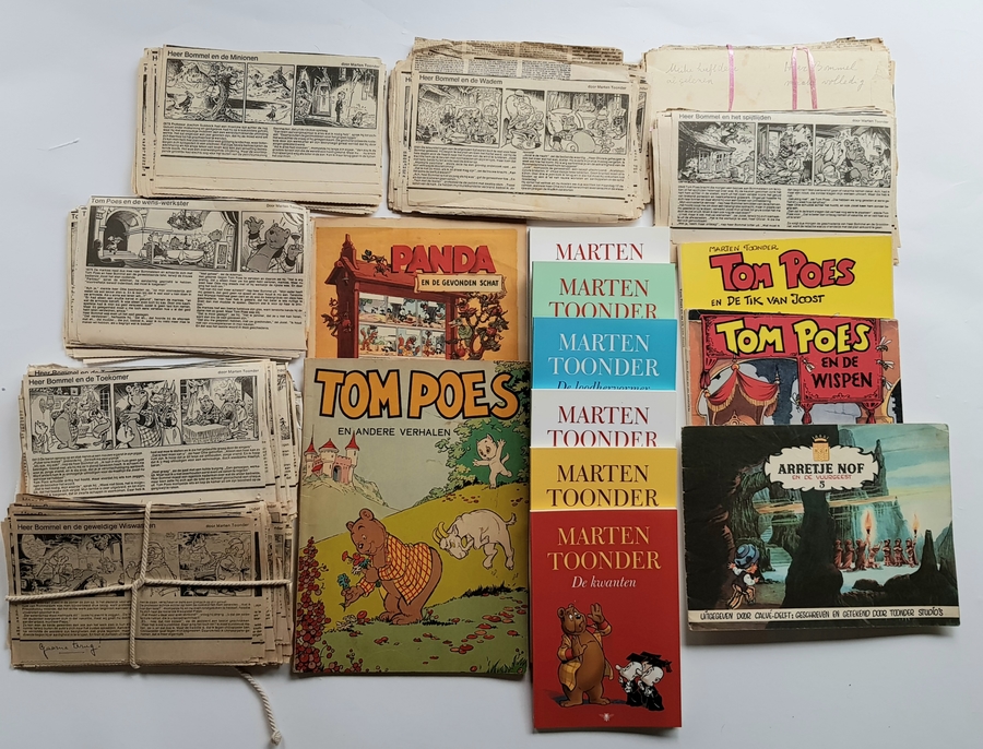 Groot aantal krantenknipsels van Heer Bommel, stripboek Panda, stripboeken Tom Poes, boeken van Olivier Bommel en Arretje Nof. |