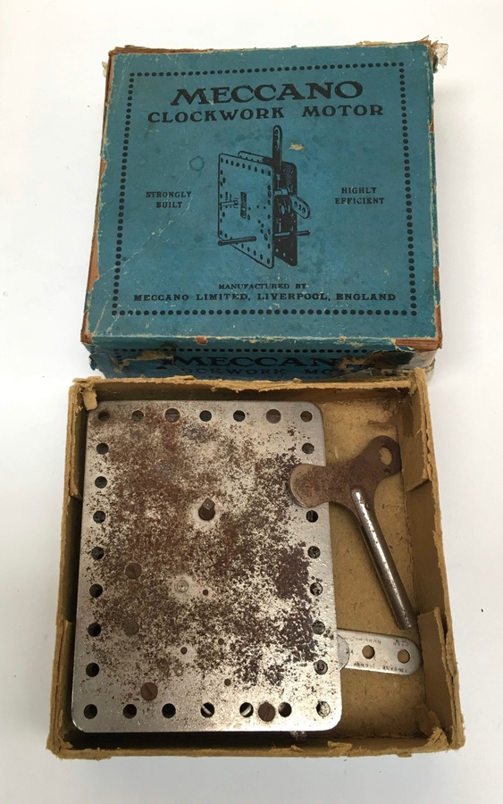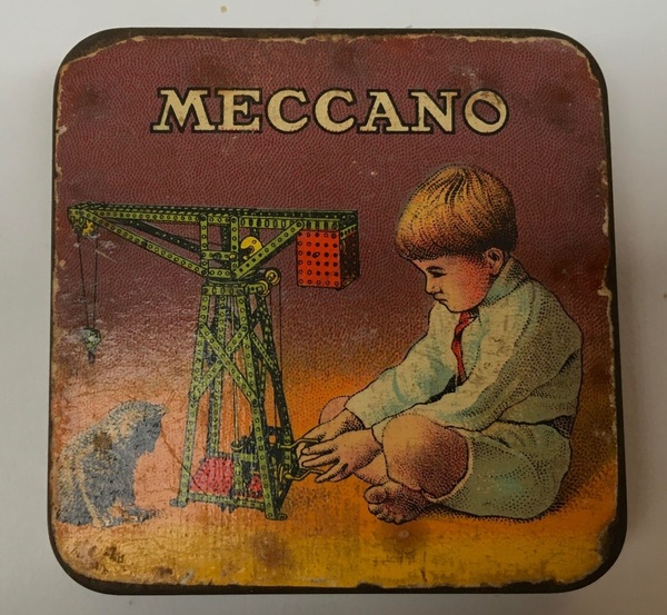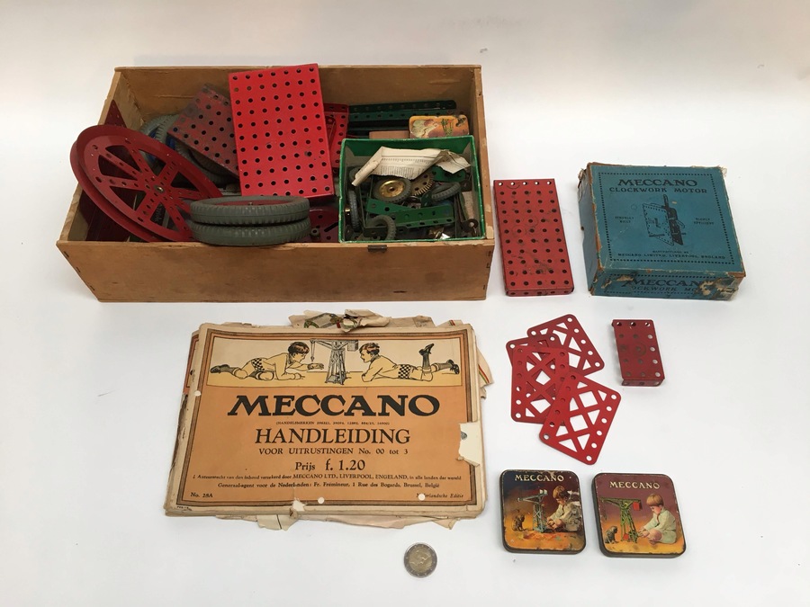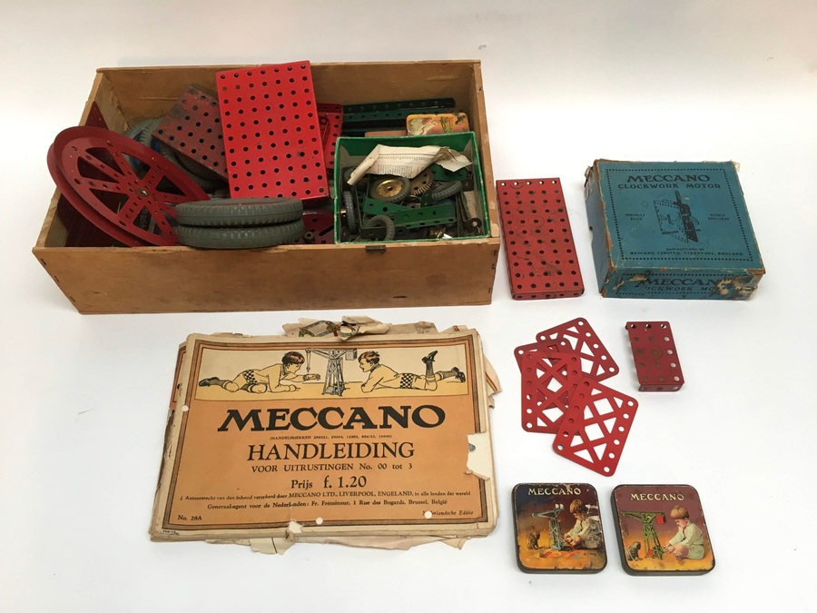Metaal/divers, lot meccano + handleidingen, 1e helft 20e eeuw. Bestaande uit een kist met onderdelen, 2 kleine blikken, doosje met opwindmechanisme + sleutel en handleidingen. |