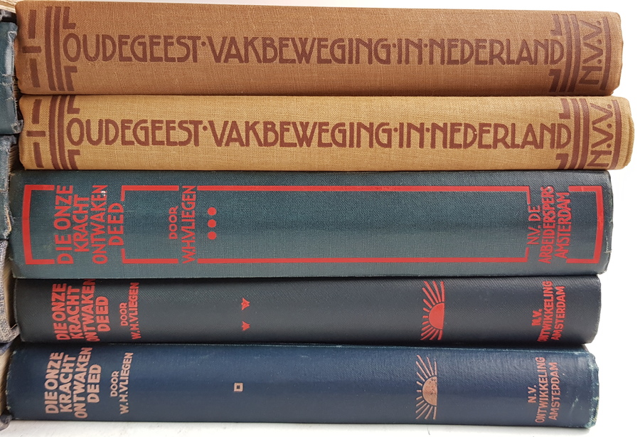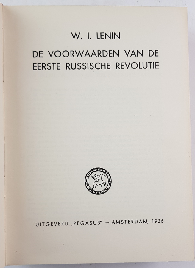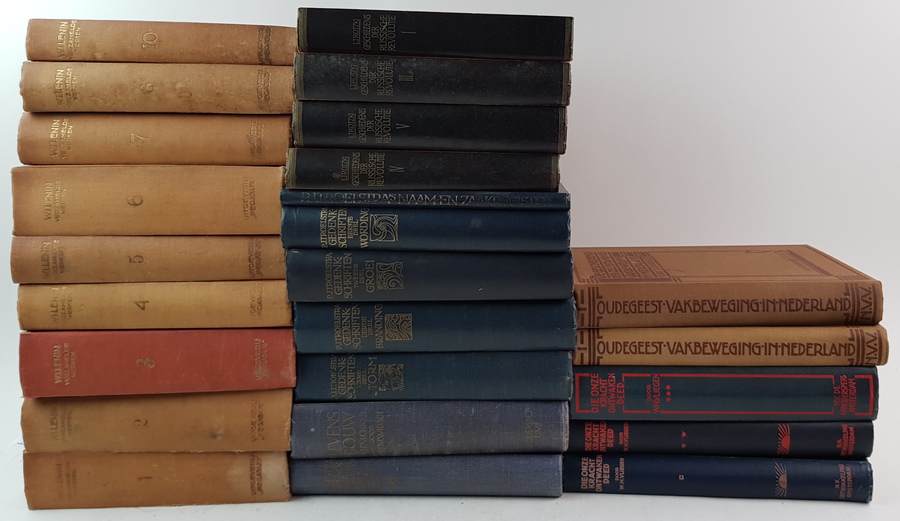 Mr. A. S. de Leeuw e.a. (reds.) - W. I. Lenin. Verzamelde Werken. Amsterdam: Uitgeverij Pegasus, 1936/1939. 9 van de 12 delen: deel 9, 11 en 12 manco. Uniform gebonden in rood linnen. Hierbij: L. Trotzki - Geschiedenis der Russische Revolutie. 4 van de 5 delen (deel 2 ontbreekt). Amsterdam: E. M. Querido, 1936; de complete serie Gedenkschriften van P. J. Troelstra en enkele andere boeken met betrekking tot het socialisme. [Totaal: 25]. |