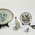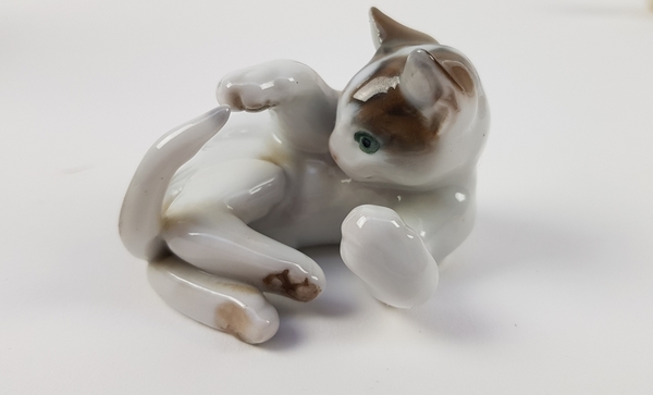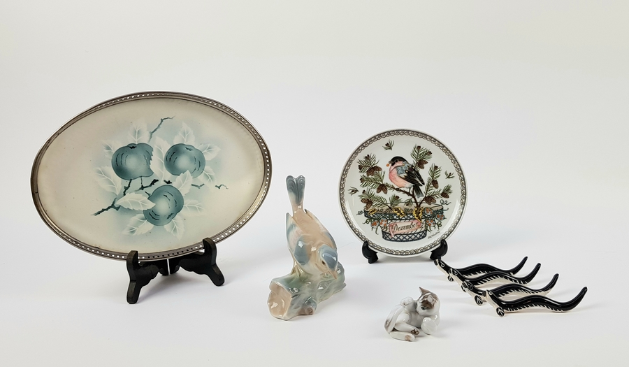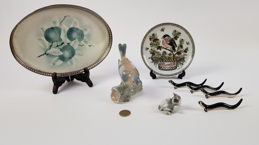 Vier messenleggers, beeld vogel, beeld kat Rosenthal, sierbord Hutschenreuther, dienblad. |