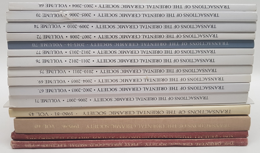 Een lot uitgaves van The Oriental Ceramic Society, waaronder 13 delen van Transactions of the Oriental Ceramics Society 1982/2015. Vele afbeeldingen in kleur en zwart-wit in de delen. Hierbij 3 andere uitgaves van eerdergenoemde Society. [Totaal: 16]. |