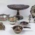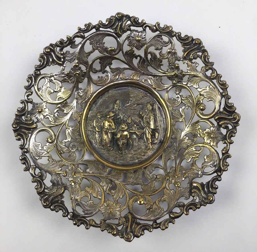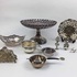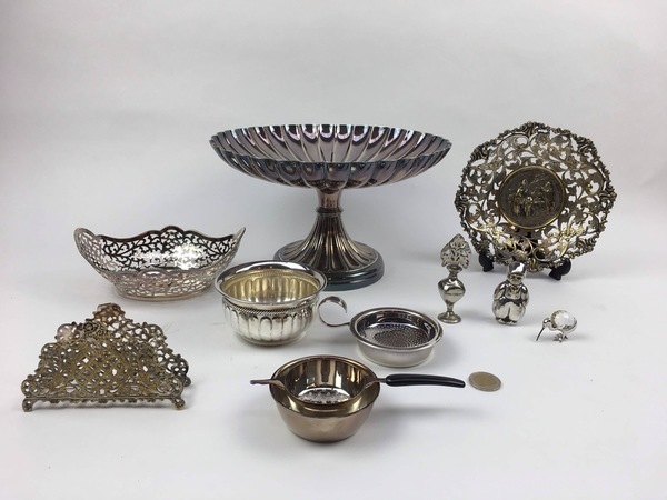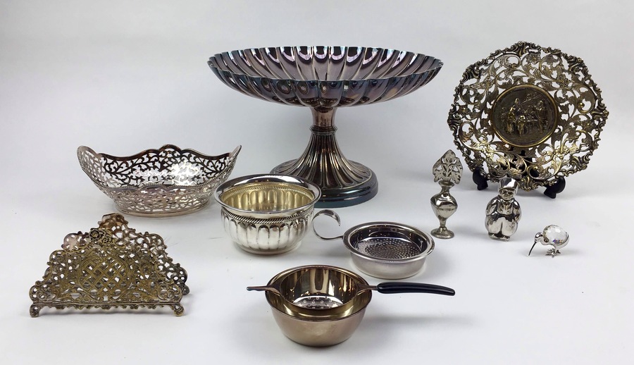 Plate, lot van 10 stuks waaronder een koekjesschaal op voet, midden 20e eeuw. Bestaande uit: koekjes/ fruitschaal, twee bonbonschalen, brievenstandaard, twee theezeefjes, parfumfles, twee strooiers en een kom. |