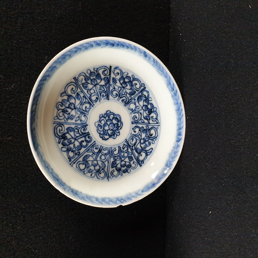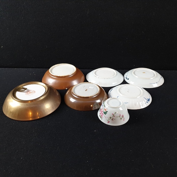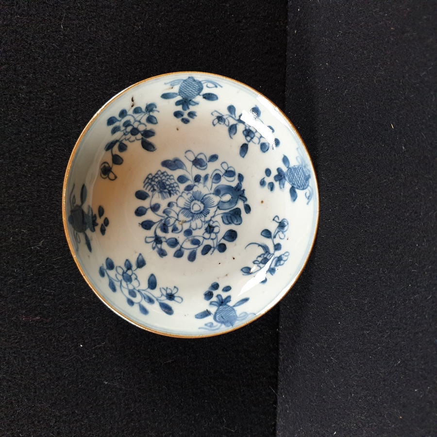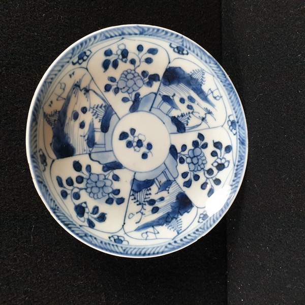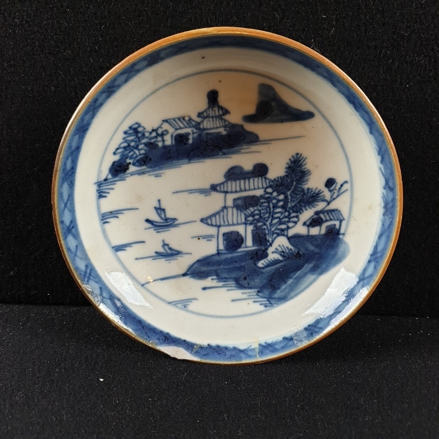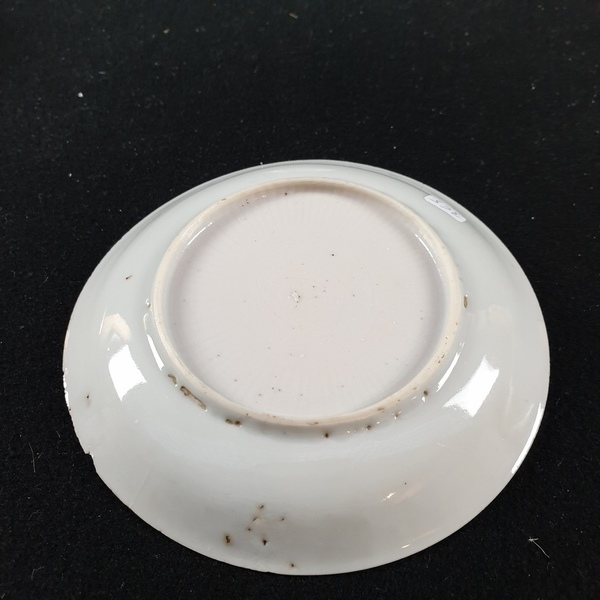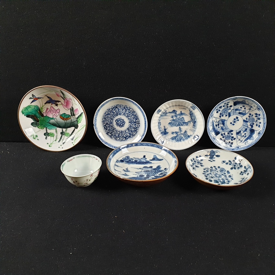 | Conditie | Redelijke conditie, landschaps bordje heeft 3 chips, famille rose kommetjes heeft twee haarlijnen en fritten,klein capucijner schotelstje heeft 1 fritting, schotel China 18e eeuw met paneeltjes heeft een paar frittings, 18e eeuws schoteltje met floraal decor heeft een chip. Bordje met visser heeft geen schade. | |