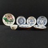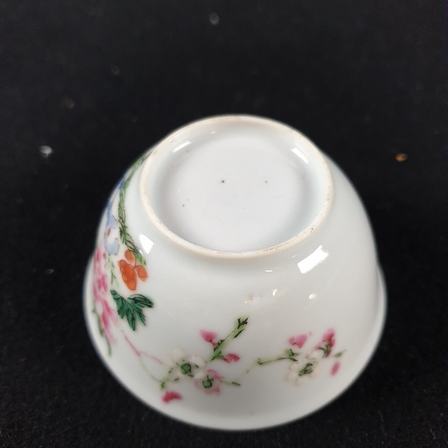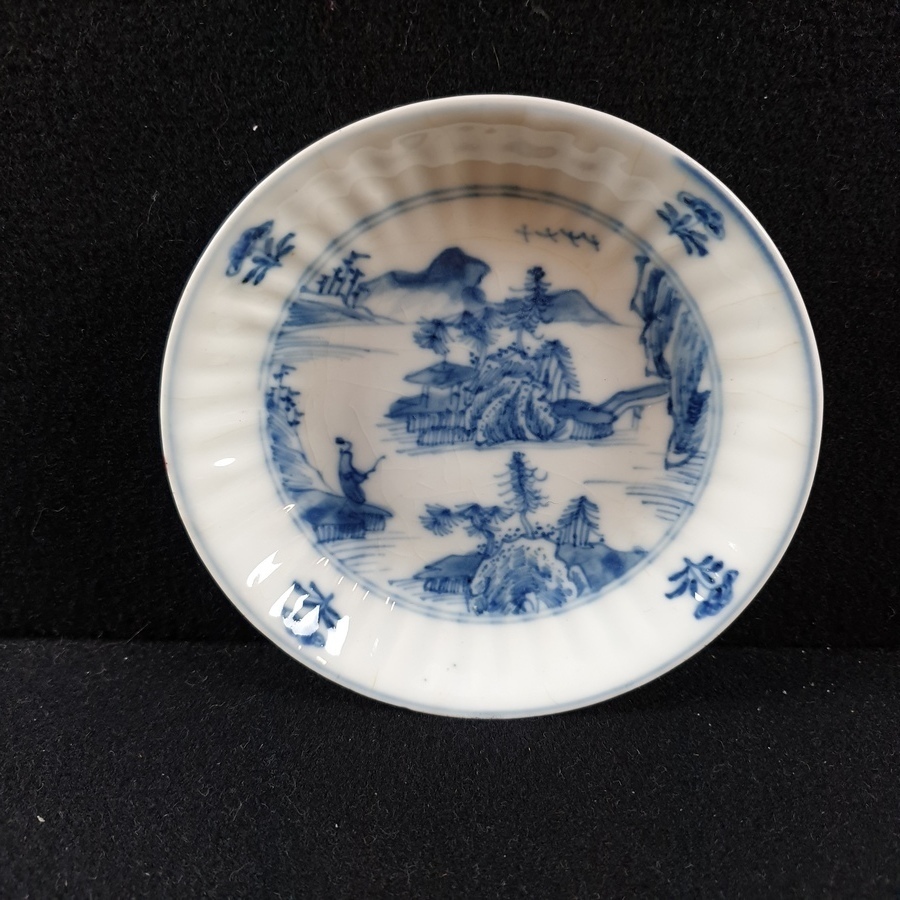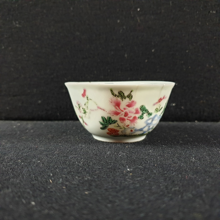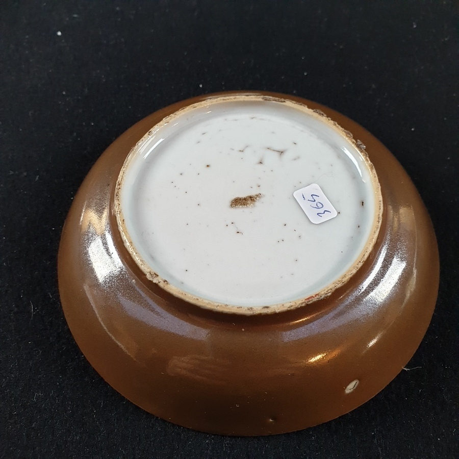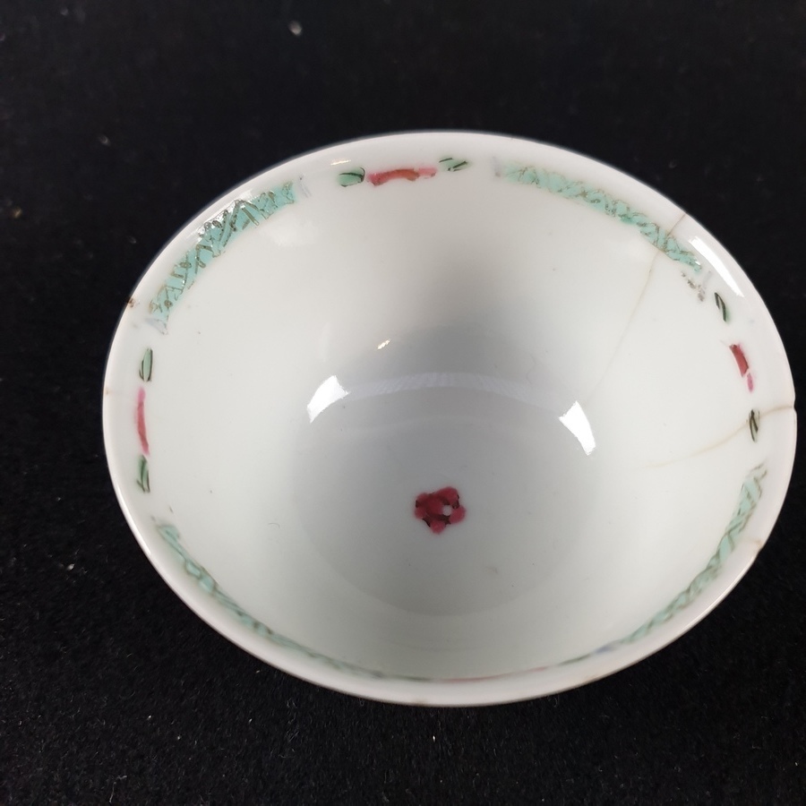 | Conditie | Redelijke conditie, landschaps bordje heeft 3 chips, famille rose kommetjes heeft twee haarlijnen en fritten,klein capucijner schotelstje heeft 1 fritting, schotel China 18e eeuw met paneeltjes heeft een paar frittings, 18e eeuws schoteltje met floraal decor heeft een chip. Bordje met visser heeft geen schade. | |