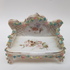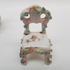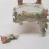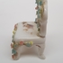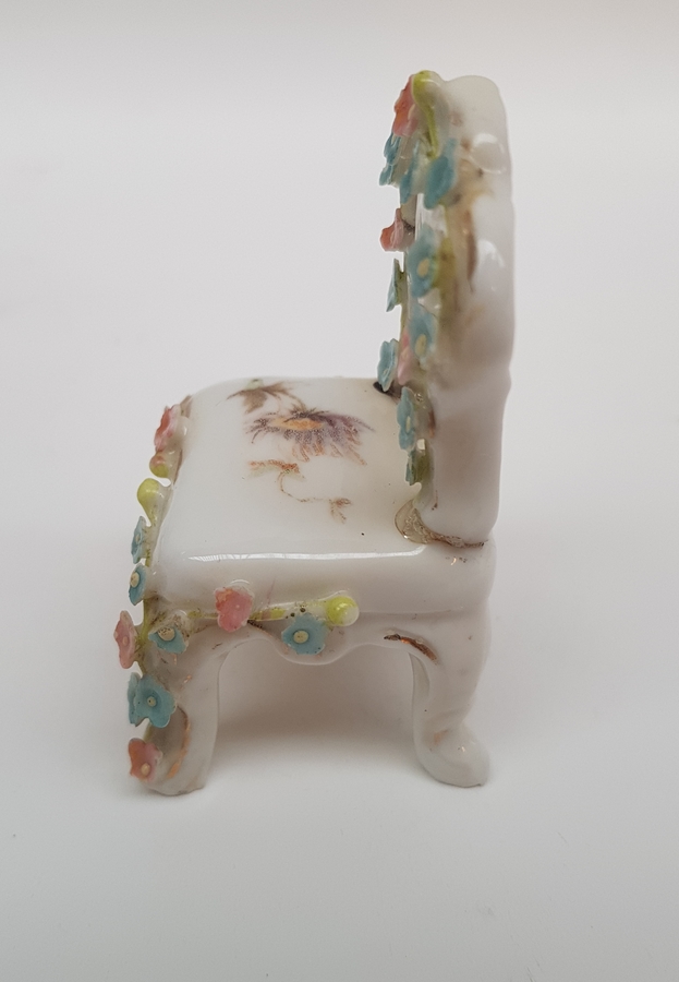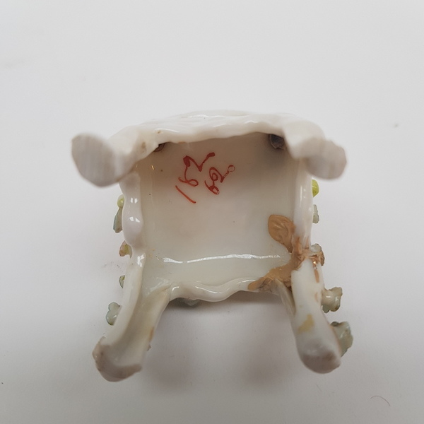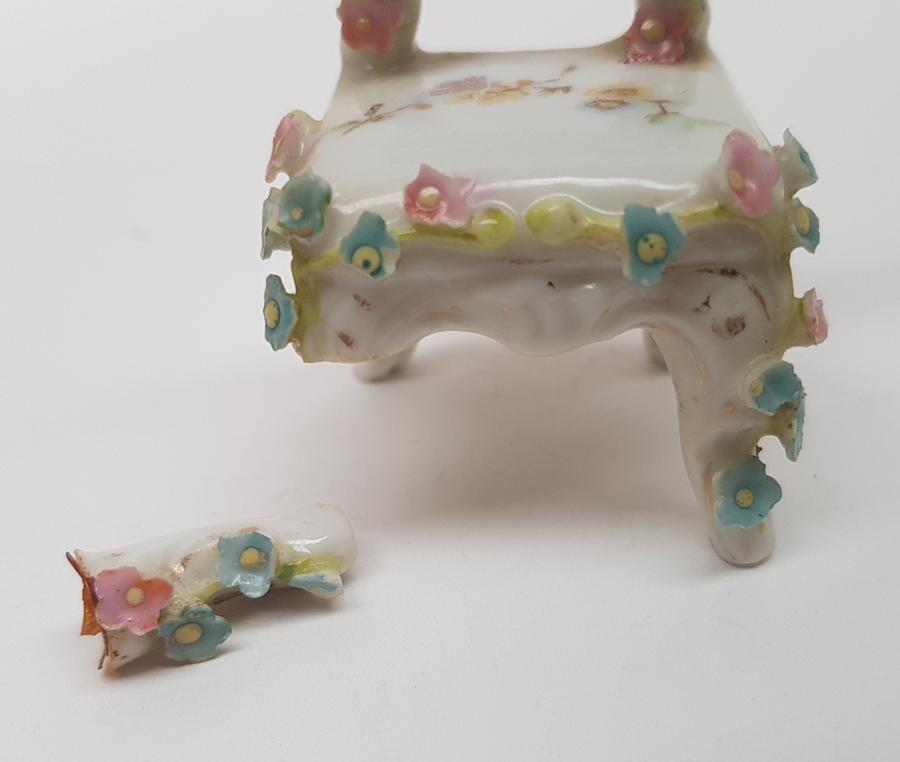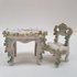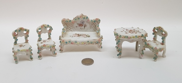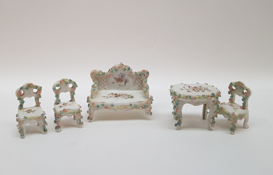 Porselein, miniatuur bank, tafel en 3 stoelen, 1e helft 20e eeuw. Versierd met kleine gekleurde porseleinen bloemen. |