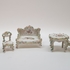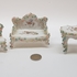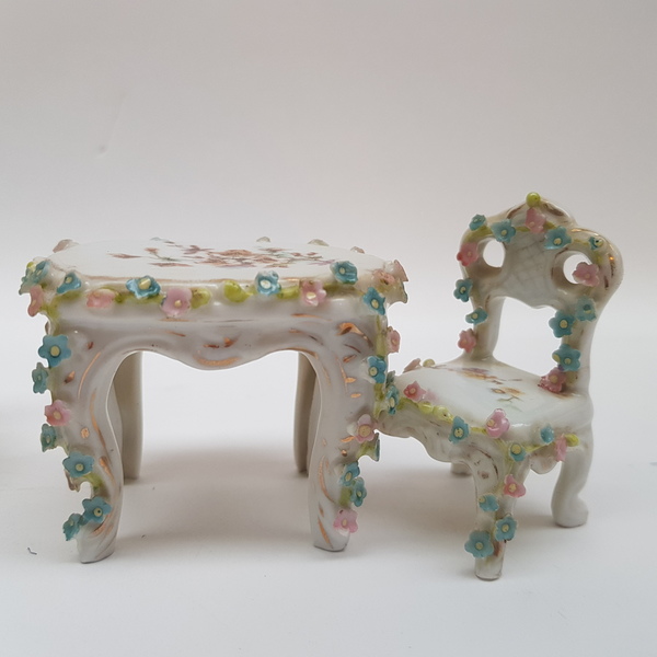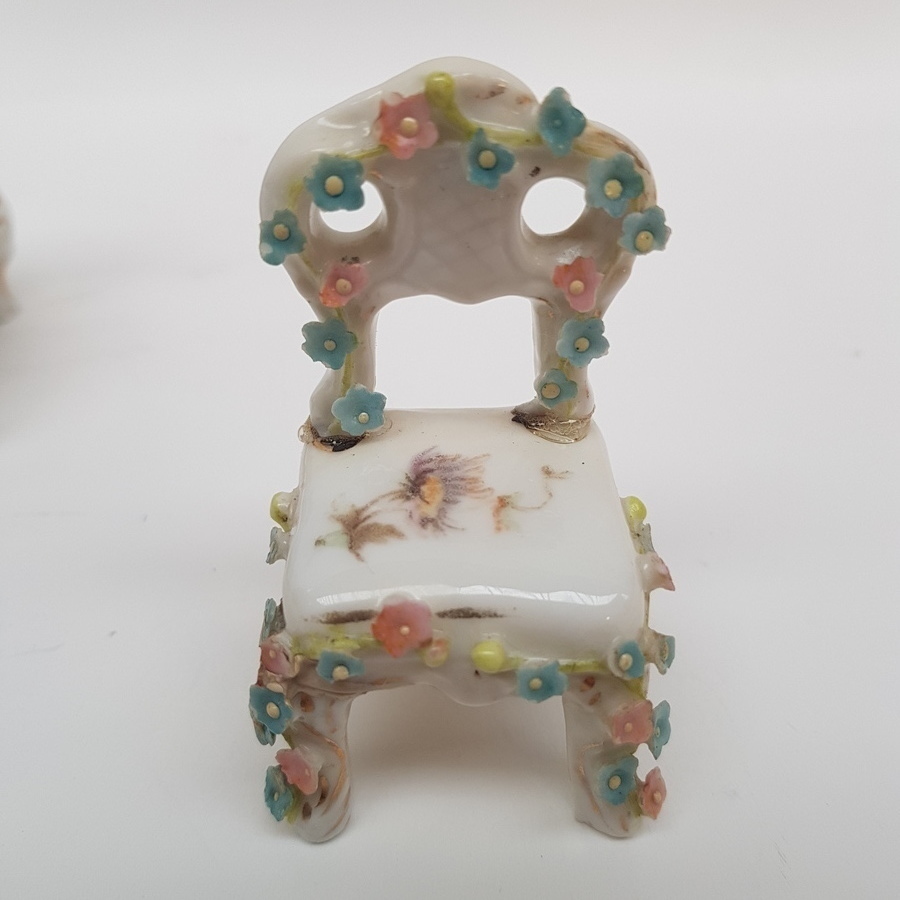 Porselein, miniatuur bank, tafel en 3 stoelen, 1e helft 20e eeuw.