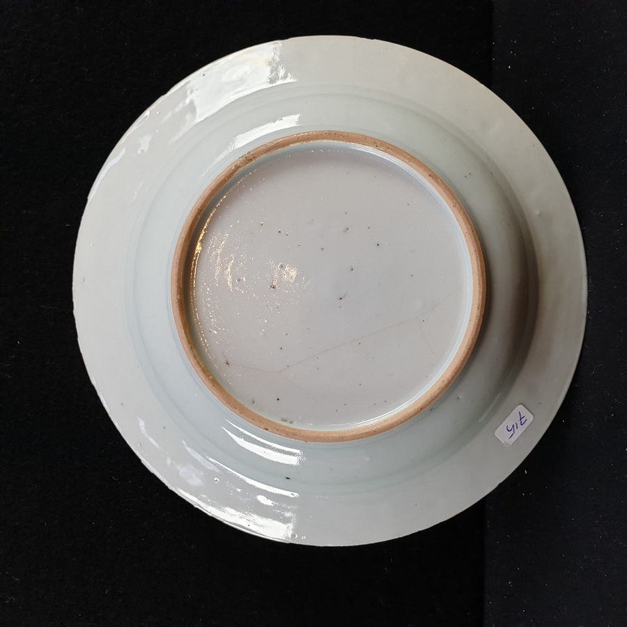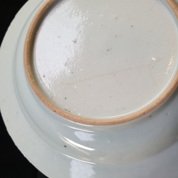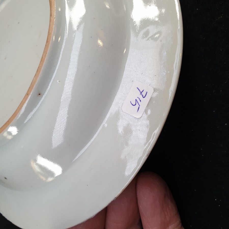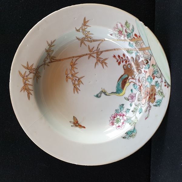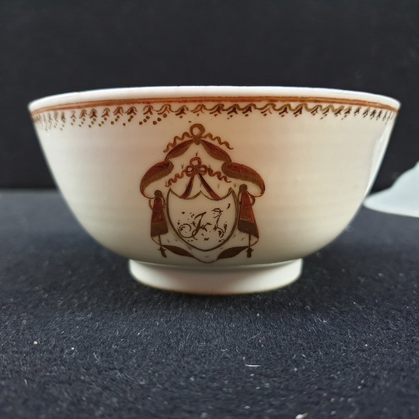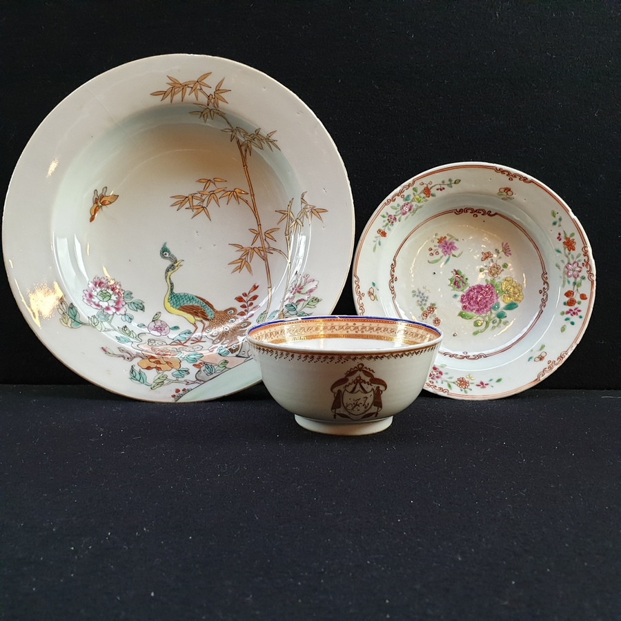 Porseleinen borden en een kom, famille rose, China, 18e eeuw, 3 stuks, Kom met familiewapen geschilderd in waarschijnlijk Frankrijk. |