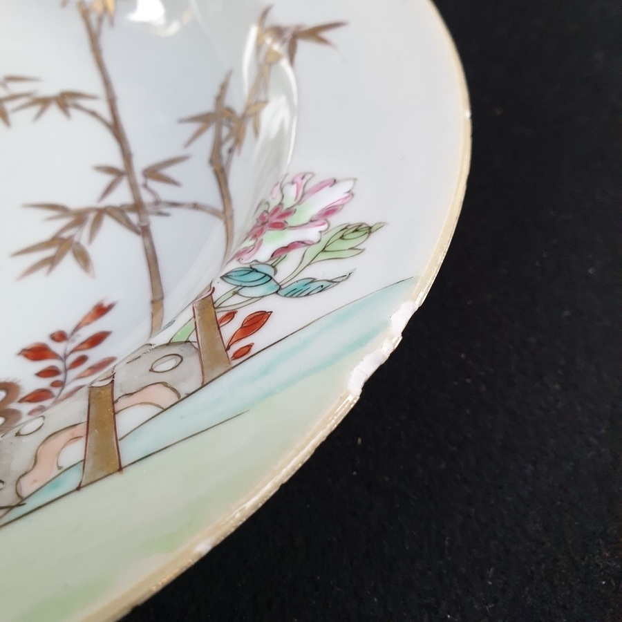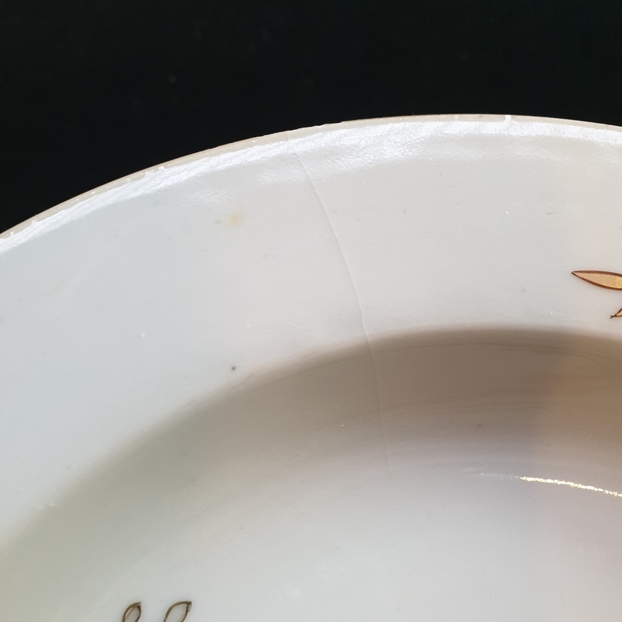 | Conditie | Redelijke conditie, groot bord heeft 2 Haarlijnen en diverse chips, Kom heeft een haarlijn en wat frittings en het kleine bord heeft bodembarst, twee haarlijnen en een fritting | |