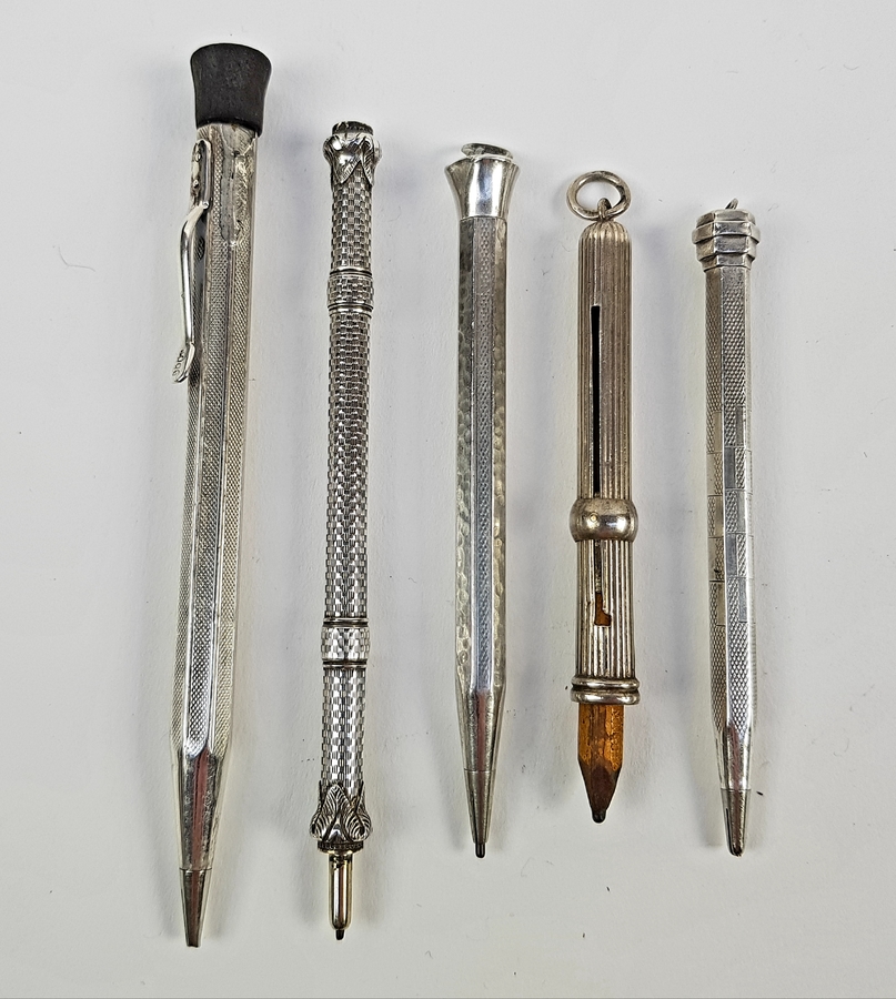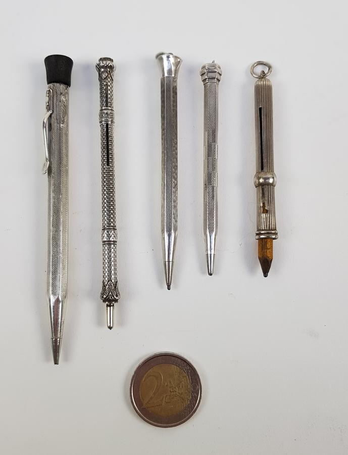 Zilver/metaal, lot van 5 vulpotloden, rond 1900.