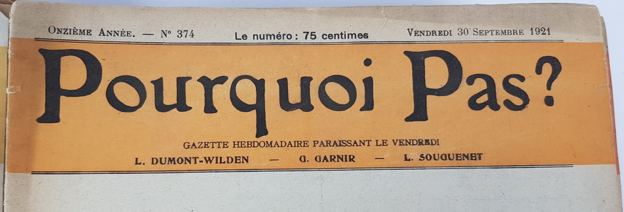 Een lot met tientallen nummers van Pourquoi Pas? uit de periode 1920-1940. Pourquoi Pas? was een Belgisch satirisch tweewekelijks tijdschrift, waaraan onder meer Jacques Ochs bijdragen leverde. Elk nummer met een fraaie voorzijde. |