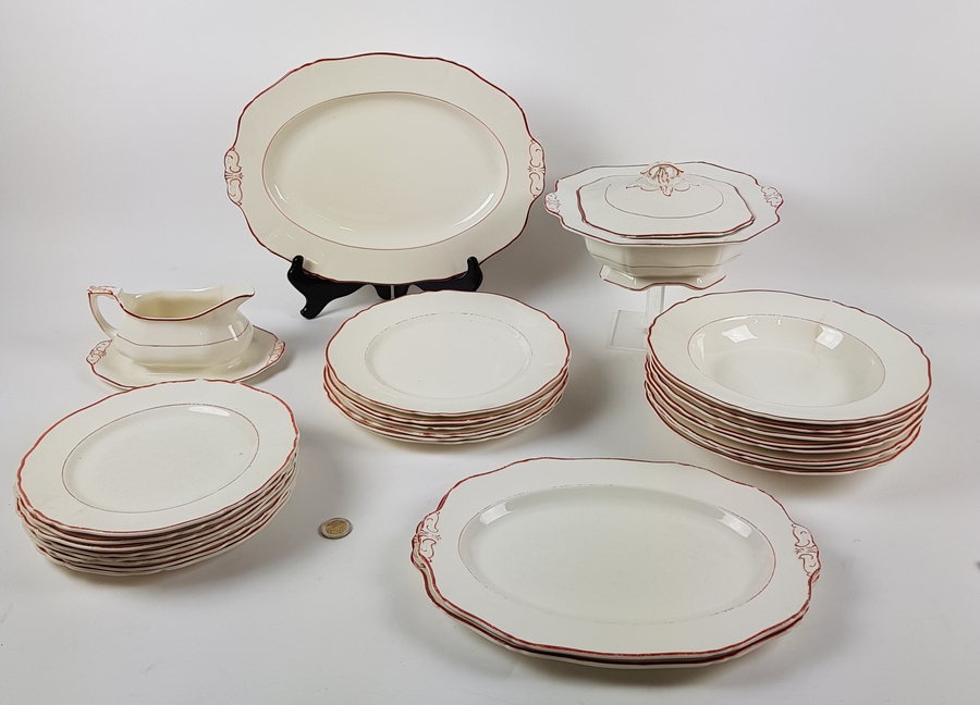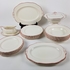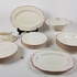 Drie serveerschalen, juskom, dekschaal, acht soepborden, zes dinerborden en acht ontbijtborden. |