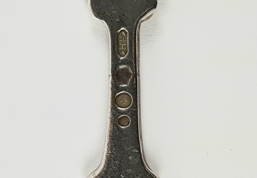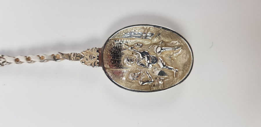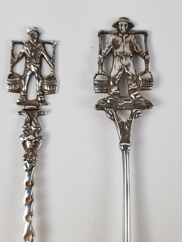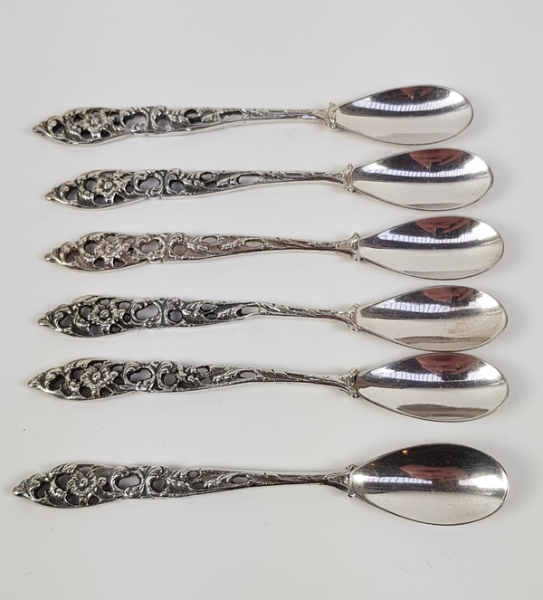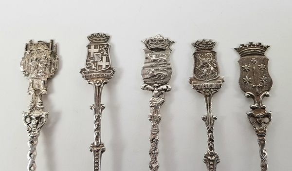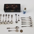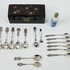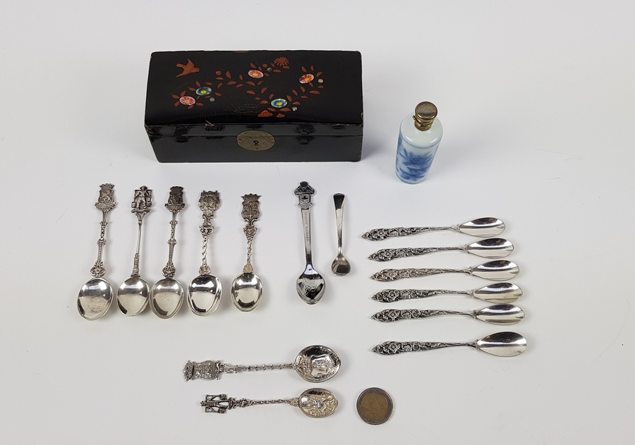 Theelepels een set van zes stuks, theelepels van steden, parfumfles en lakdoos. |
