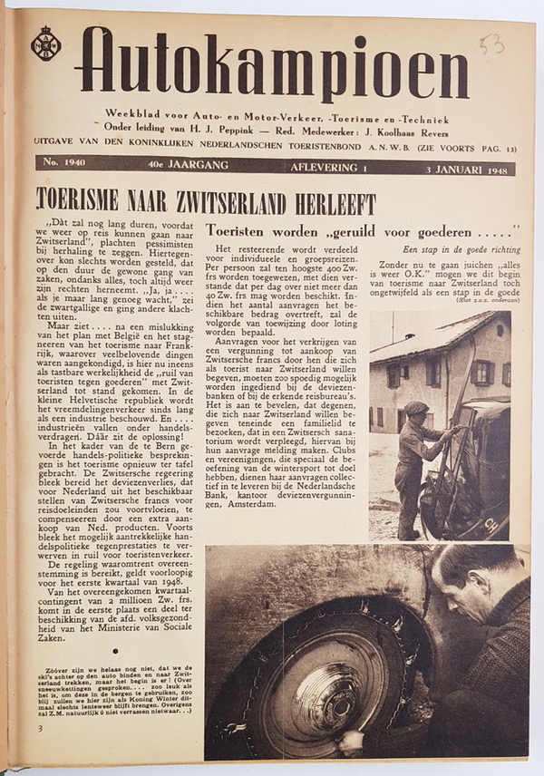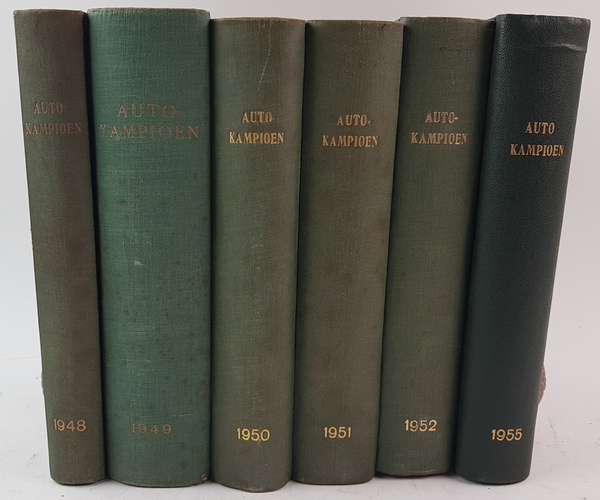 ANWB - Autokampioen. 6 jaargangen compleet: 1948-1952 en 1955. 5 jaargangen gebonden in halflinnen, 1 in linnen. Met vele advertenties, foto's en verhalen met betrekking tot auto's. Het geheel zorgt voor een mooi tijdsbeeld. |
