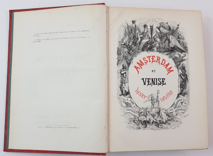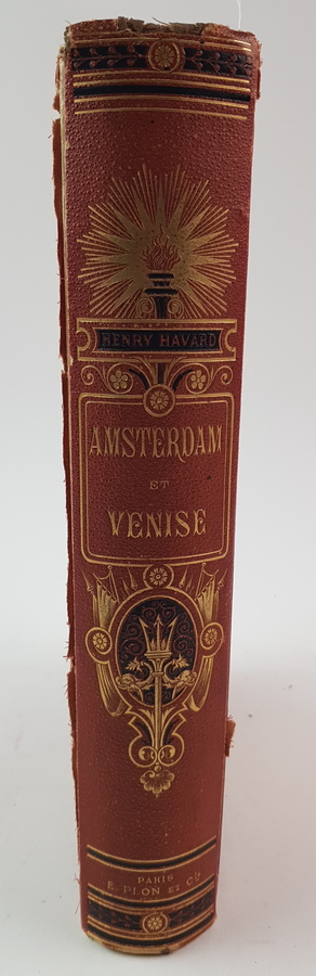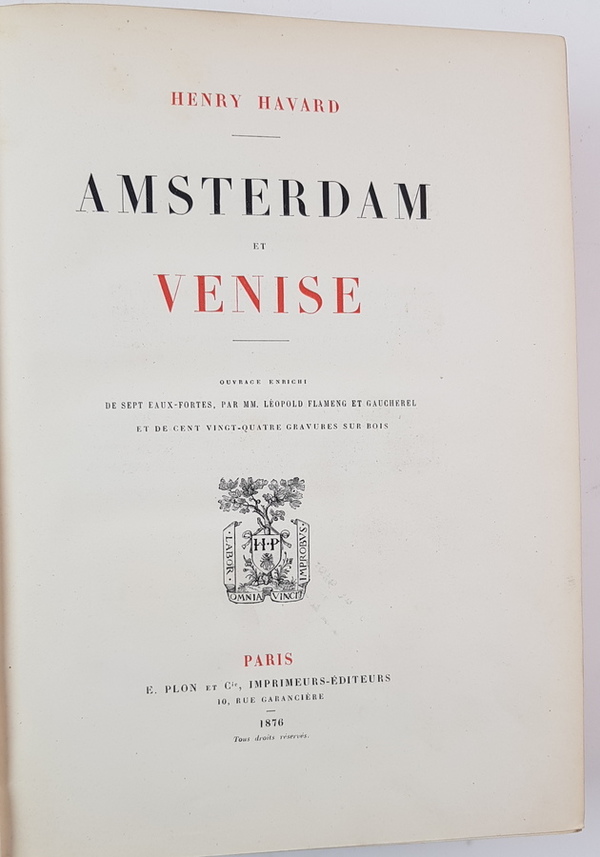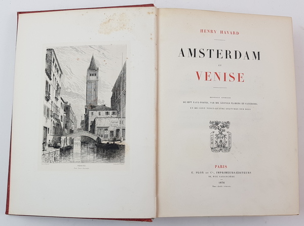 Henry Havard - Amsterdam et Venise. Paris: E. Plon et Cie, Imprimeurs-editeurs, 1876. Gebonden in linnen. Gestempelde platten en rug met goudopdruk. Goud-op-snee. 4vo (28x21 cm). Met 7 platen beschermd door een Japans papiertje en 124 gravures. 636pp. |