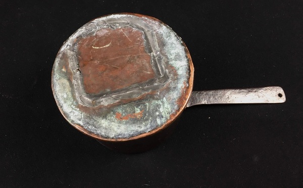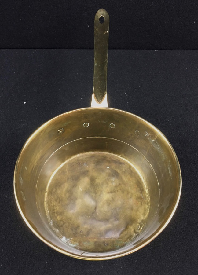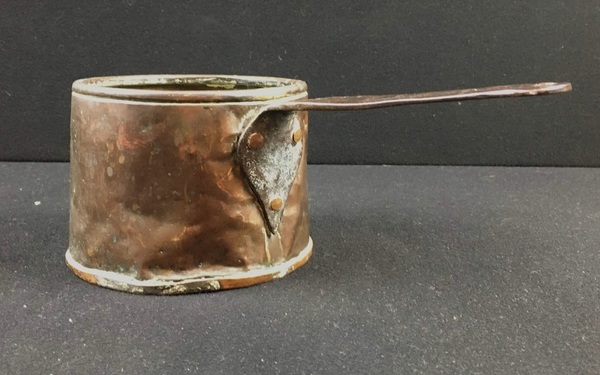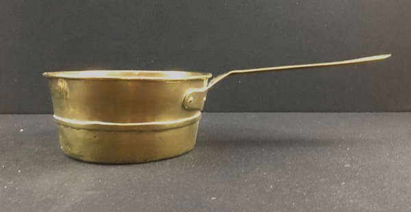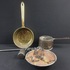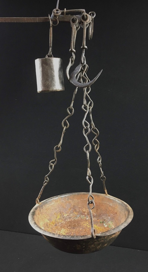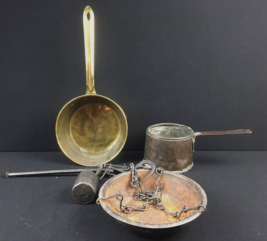 Messing/koper/smeedijzer, Twee pannen en weegschaal, 19e eeuw.