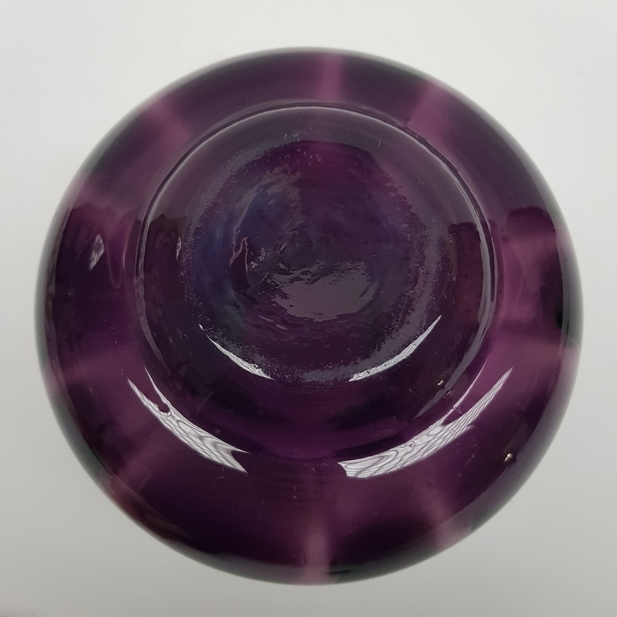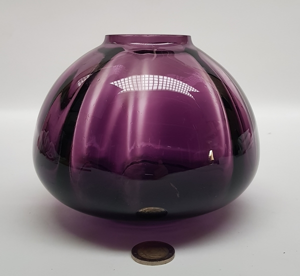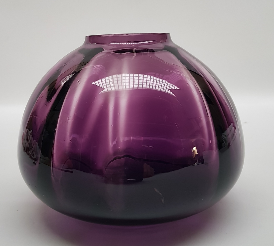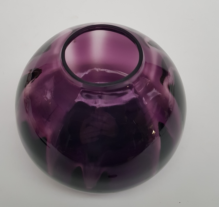 Glas, vaas van het model Mira nr. 3 voor Kristalunie Maastricht, Maastricht 1931. Ontwerp van W.J.Rozendaal. Kleur: Paars. Afgebeeld in: Catalogus "N.V.Kristalunie Maastricht 1932-1933": pagina 28. |