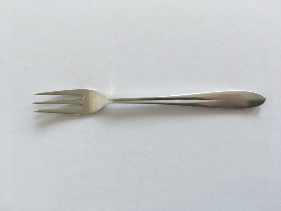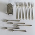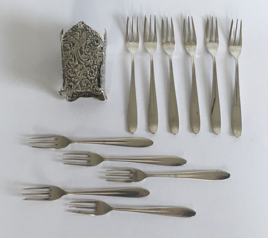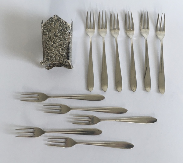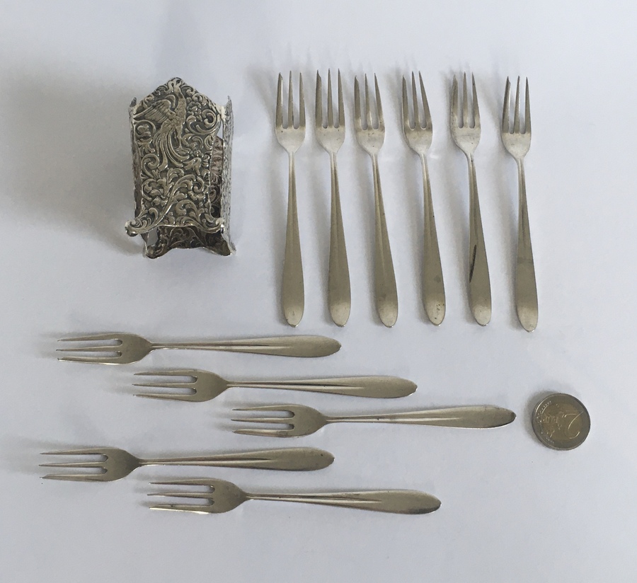 Zilver, gebaksvorken + fleshouder, midden 20e eeuw.