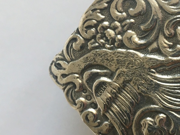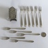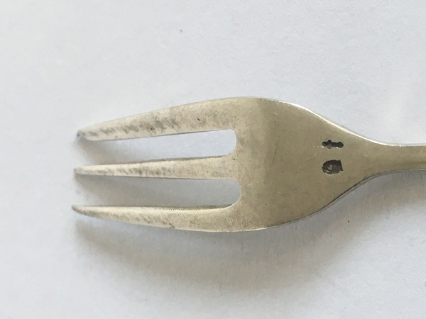 Zilver, 11 gebaksvorken + fleshouder, midden 20e eeuw. Vorken zijn gemerkt: klein zwaar + een ander merk ( onbekend). Maggie fleshouder is gemerkt: Minerva, lopende leeuw 2, jaarletter R= 1977 en meesterteken: Gebr. Huisman Schoonhoven. |