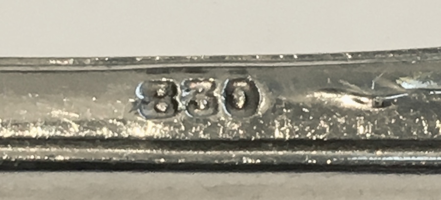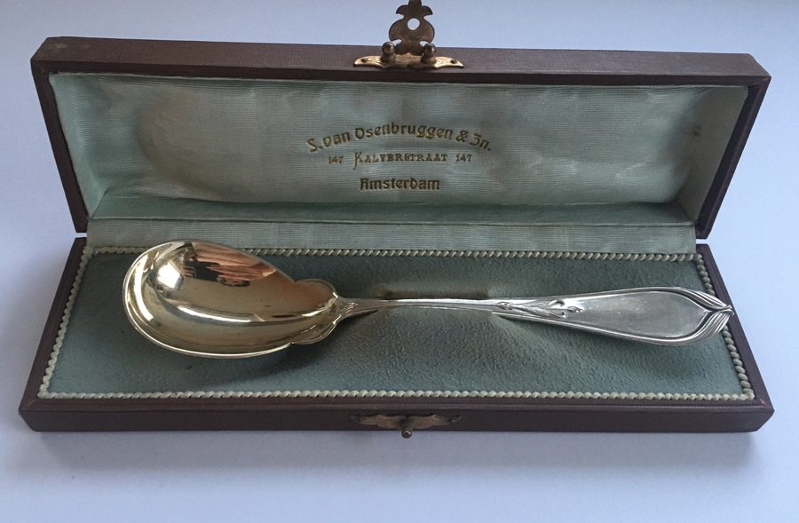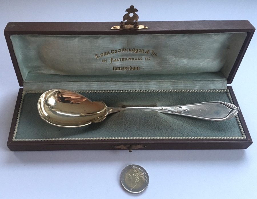 Zilver, Jugendstil sauslepel in doos, ca 1910. Uitgevoerd met fraaie jugendstil lijnen en vergulde bak. Gemerkt: 830 (830/1000 zilver) en V= vreemd/ buitenlands zilver. |