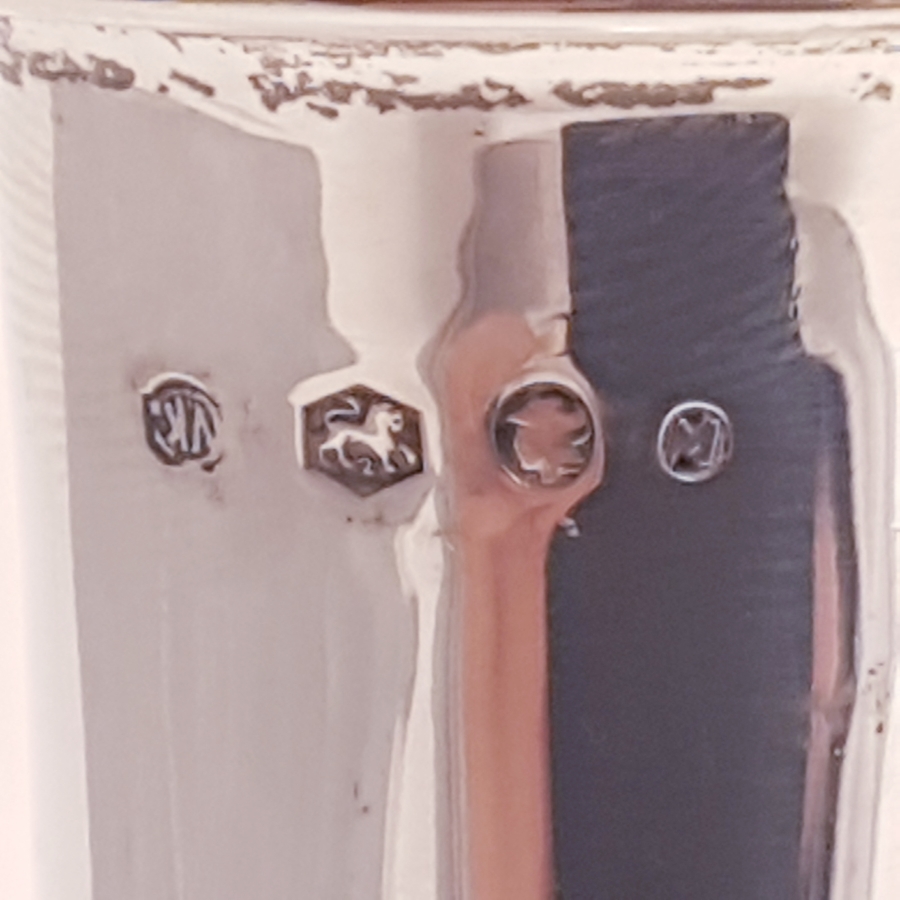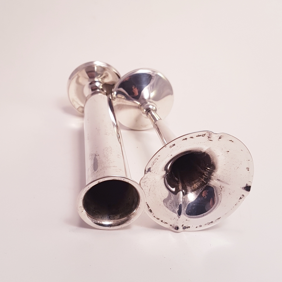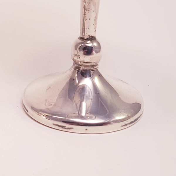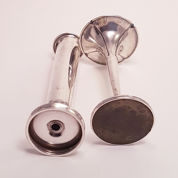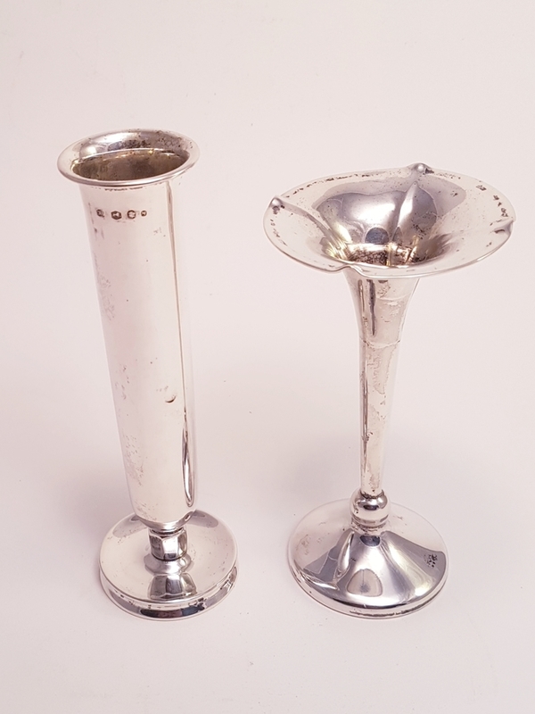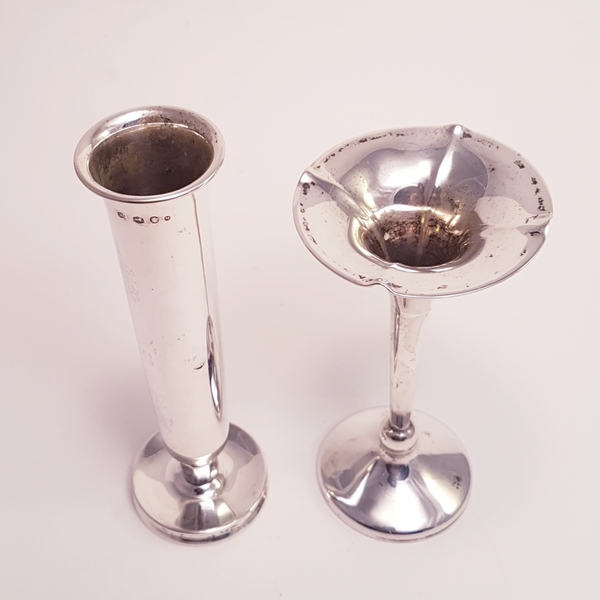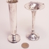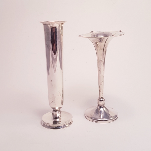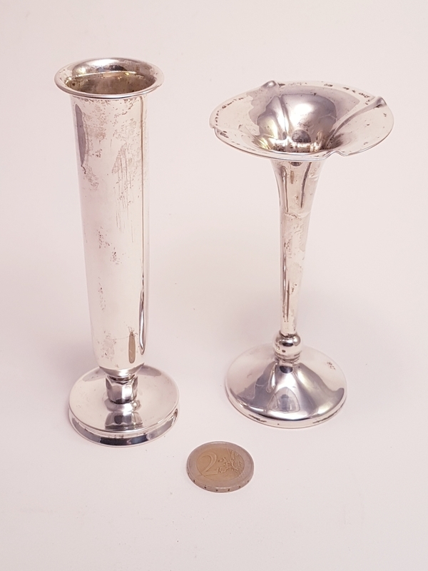 Zilver, kleine anjervaas + 1 andere, Nederlands midden 20e eeuw. De anjervaas is onduidelijk gemerkt en verzwaard . De andere vaas is gemerkt: Minerva, lopende leeuw 2, jaarletter M=1947 en meesterteken: Gerritsen & v.Kempen Zeist. |