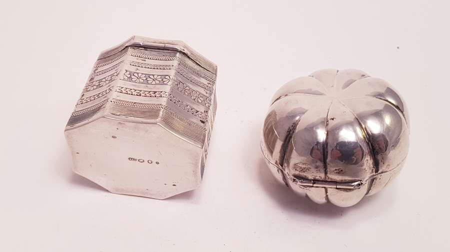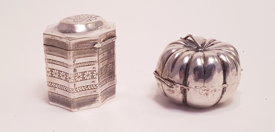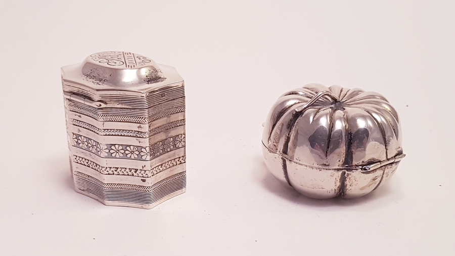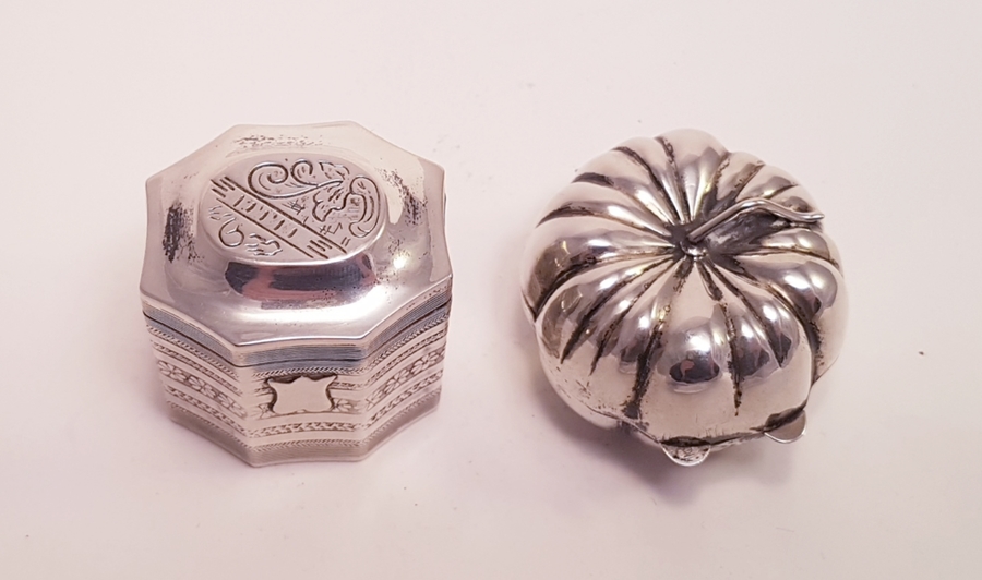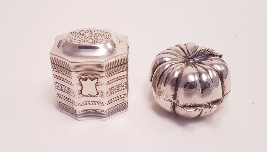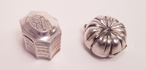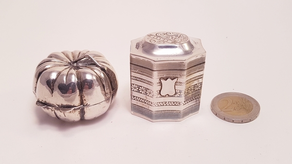 Zilver, Lodereindoos + 1 andere in de vorm van een pompoen o.a Nederlands 1974.