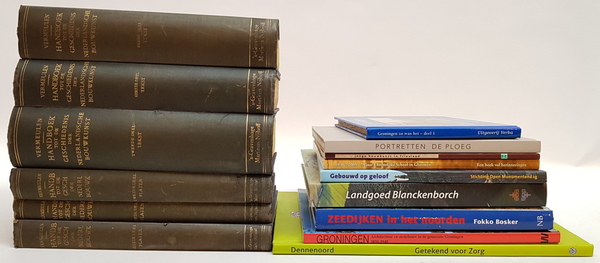 F. A. J. Vermeulen - Handboek tot de Geschiedenis der Nederlandsche Bouwkunst. 6 delen, compleet (3 delen tekst, 3 delen platen). 's-Gravenhage: Martinus Nijhoff, 1928/1941. Uniform gebonden in blauw linnen met goudopdruk op voorplat en rug. Tekstdelen ca. 500pp. per deel; de delen met platen gemiddeld 300 pp. per deel. Hierbij 10 boeken over kunst en architectuur, met name met betrekking tot de provincie Groningen en een H. N. Werkman verjaardagskalender [Totaal: 16].