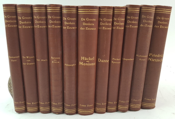 J. A. Bergmeijer e.a. (bewerking) - De Groote Denkers der Eeuwen, 11 delen. Amsterdam: Cohen Zonen, z.j. [ca. 1900]. Uniform gebonden hardcovers, linnen. Ca. 300pp per deel. 8vo (21x17 cm). [Totaal: 11]