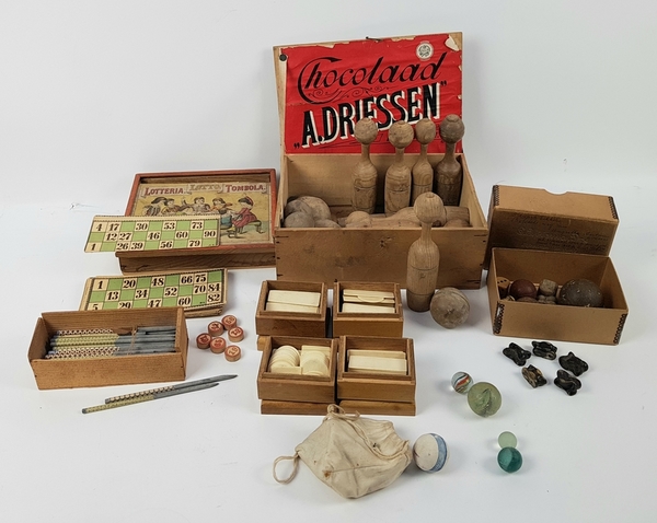 Diverse spellen o.a. bikkelen en tombola wo. Driessen cacao, eerste helft 20e eeuw