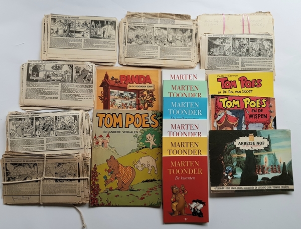 Groot aantal krantenknipsels van Heer Bommel, stripboek Panda, stripboeken Tom Poes, boeken van Olivier Bommel en Arretje Nof.