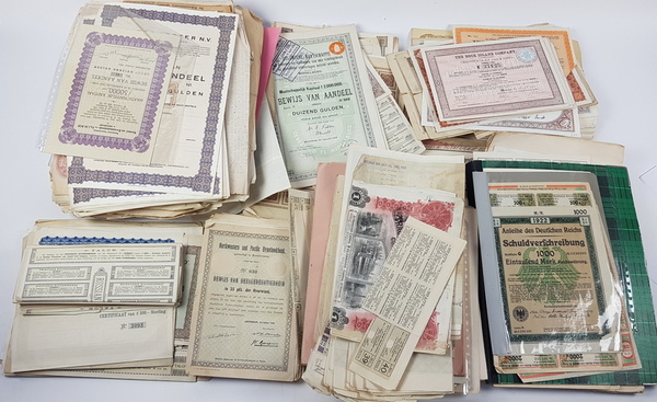 Een uitgebreid lot aandelen, bijna een verhuisdoos vol. Onder meer met aandelen van The Rock Company, Unilever en de Kaiser Frazer Corporation.