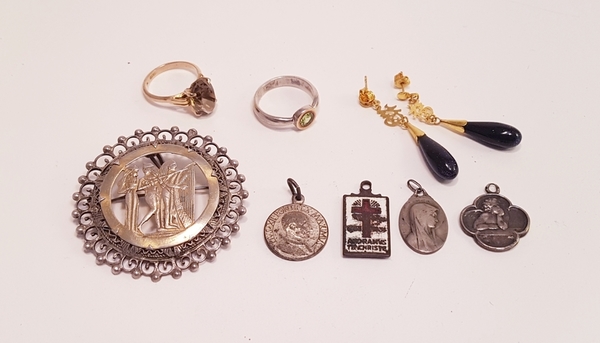 Zilver/ doublé, lot van 8 stuks diverse sieraden, 20e eeuw. Bestaande uit: A. Zilveren hanger/broche met Egyptische dames. B. 4 religieuze hangers waarvan 1 onedel. C. zilveren ring met steen. D. Doublé ring en oorbellen.