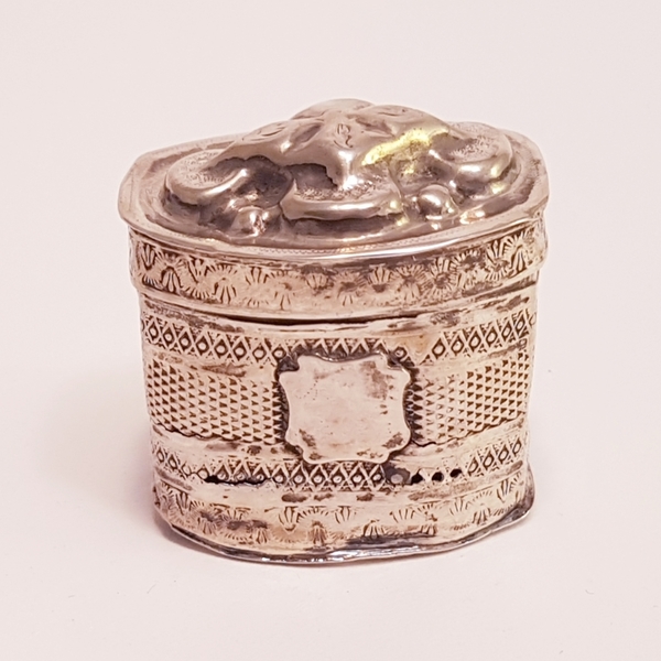 Zilver, lodereindoos, Nederlands 1866. Bewerkte doos en met initialen in schild: M J K en 1866. Gemerkt: Minerva, lopende leeuw 2 , jaarletter G=1866 en meesterteken: slecht te lezen.( vermoedelijk Jan Schijfsma Sneek.