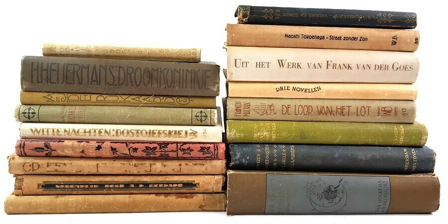 Divers lot literatuur, veelal in Art Nouveau en Art Deco boekbanden. Onder andere Stijn Streuvels - Zomerland (2e druk); Naoshi Tokoenaga - Straat zonder zon; A.M. de Jong - De Rijkaard en H. Heijermans - Droomkoninkje. Totaal 17 boekbanden, eerste helft 20e eeuw.