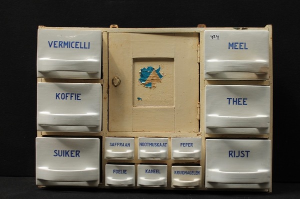 924. Jaren 50 keukenrek koffie, thee en suiker etc.