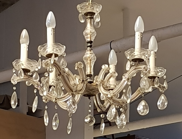 Kristal/glas, 6-armige kroonluchter, midden 20e eeuw. Zogenaamde Marie Therese lamp met pegels.