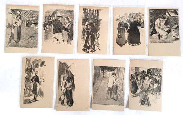 Een lot met 9 proefdrukken/Halffabrikaten van ansichtkaarten naar ontwerp van Theophile Steinlen.