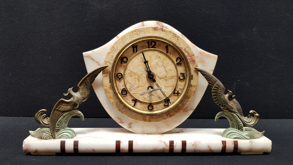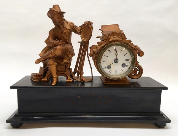 798. Zamac klok met een figuur op marmeren voet, Frankrijk, 19e eeuw