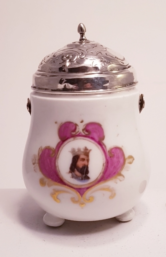 De porselein bak heeft een schildering van een gekroonde man. Gemerkt: klein zwaard en meesterteken: onleesbaar.