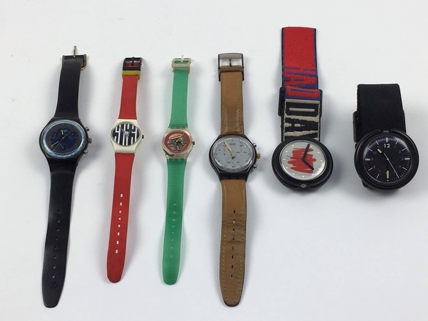 801. Plastic/divers, lot van 6 Swatch horloges, 20/21e eeuw.