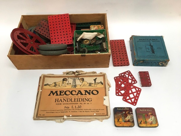 Metaal/divers, lot meccano + handleidingen, 1e helft 20e eeuw. Bestaande uit een kist met onderdelen, 2 kleine blikken, doosje met opwindmechanisme + sleutel en handleidingen.