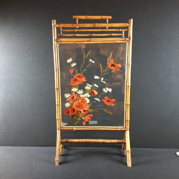 Bamboe haardscherm, China, eerste helft 20e eeuw, glas in waarschijnlijk Nederland beschilderd.