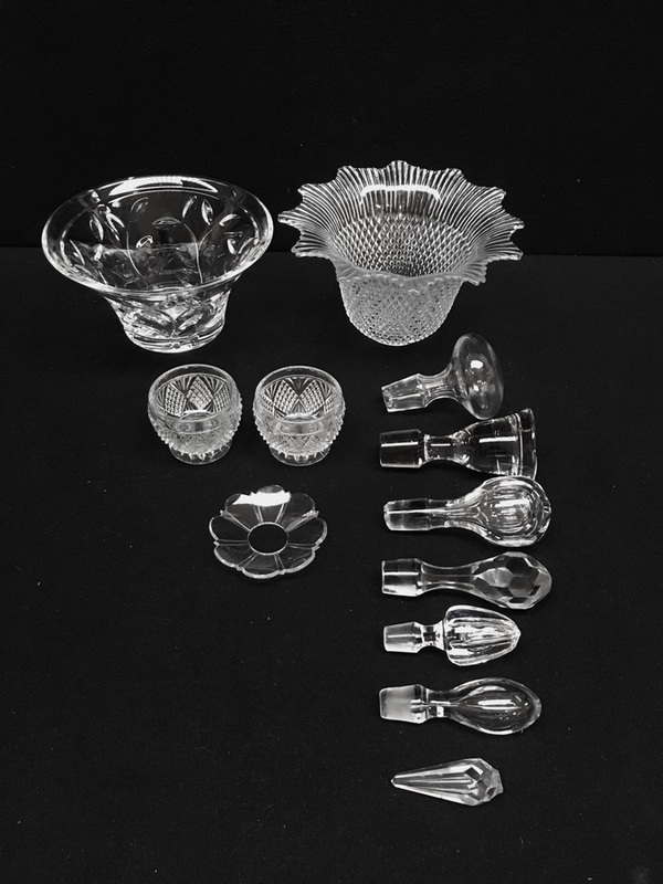 Kristal/glas, lot van 12 stuks waaronder 7 karaf/fles stoppen, 19/20e eeuw. Bestaande uit: Twee schalen, zeven stoppen, druppelvanger en twee glaasjes.