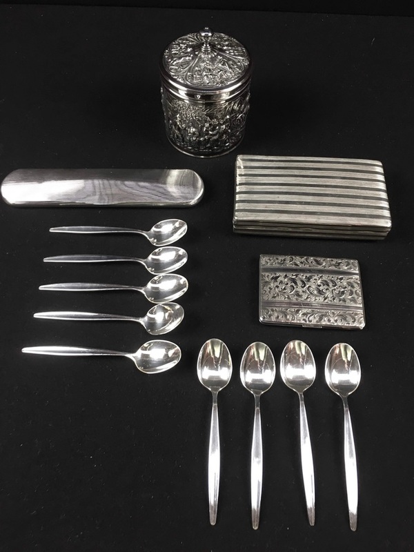 Plate/alpacca, lot van 7 stuks waaronder een brillenkoker, 19/20e eeuw. Bestaande uit: Brillenkoker, tabaksdoos, sigarettencase, 9 theelepels en een tabakspot.