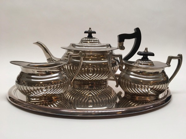 Plate, koffieservices 4-delig, midden 20e eeuw. Bestaande uit: Dienblad, theepot, suikerpot en melkkan.