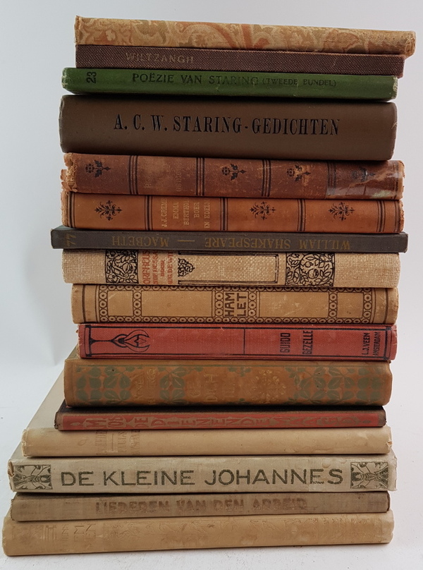 Een divers lot boeken, veelal op het gebied van literatuur en poezie. Een aantal boeken in een fraaie Art Nouveau/Art Deco boekband. Onder andere met titels van Guido Gezelle en A. C. W. Staring. [Totaal: 16].