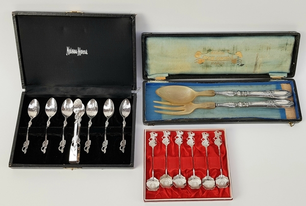 Zilver/ verzilverd, Divers lot bestek, 1e helft 20e eeuw. Bestaande uit: Sla couvert zilver (manche argent controle Paris), theelepels zilver , theelepels met suikertang verzilverd (Neiman Marcus). Alle 3 in bijbehorende doos.