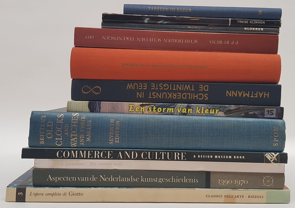 Een divers lot boeken met betrekking tot kunst, waaronder een aantal boeken over klokken en tapijten. [Totaal: 12].