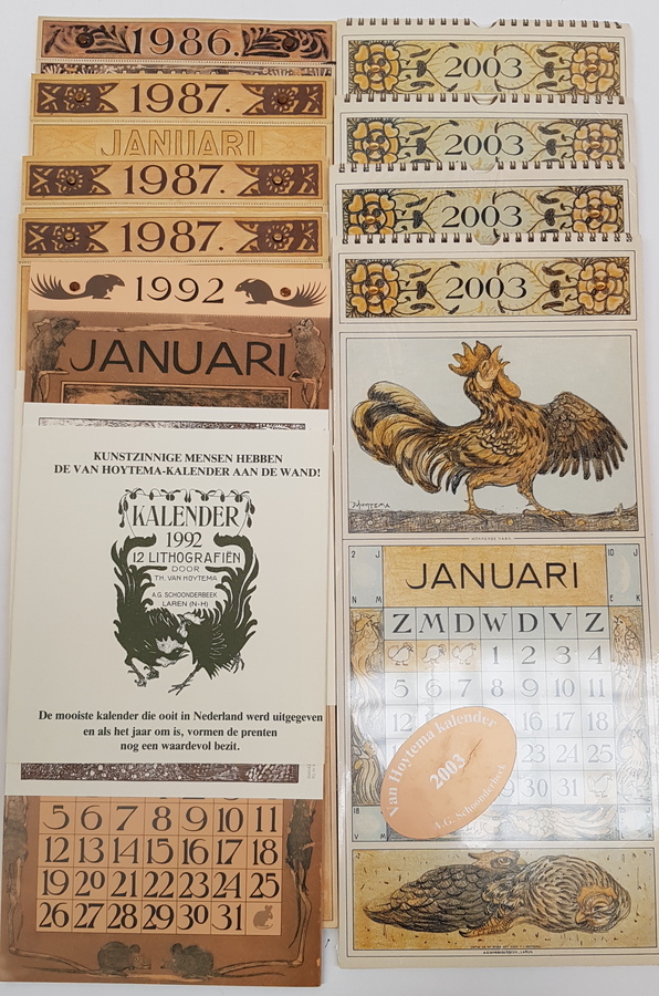 Een lot met 9 Hoytema-Kalenders: 1986; 1987 (3 ex.); 1992; 2003 (4 ex). Heruitgave in facsimile van uitgeverij Schoonderbeek, Laren van de originele kalenders van Hoytema, uitgegeven aan het begin van de 20e eeuw. 12 lithografieen per kalender. [Totaal: 9].