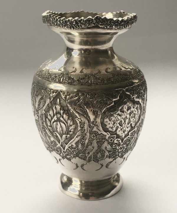 889. Zilver, kleine fijn bewerkte vaas, omgeving Perzië, midden 20e eeuw.