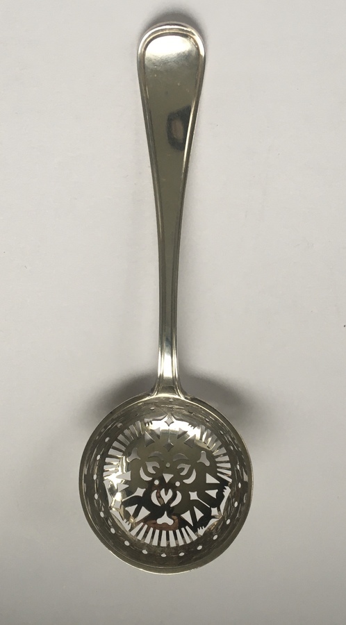 Zilver, strooilepel, Amsterdam 1904. Gemerkt: Minerva, lopende leeuw 2, jaarletter u= 1904 en meesterteken: Daniël van Outvorst Amsterdam. en Hoeker & zoon.